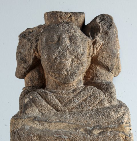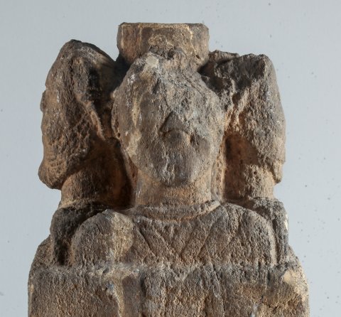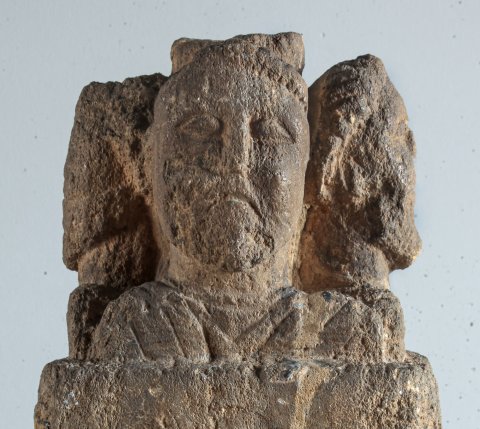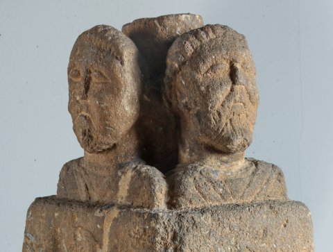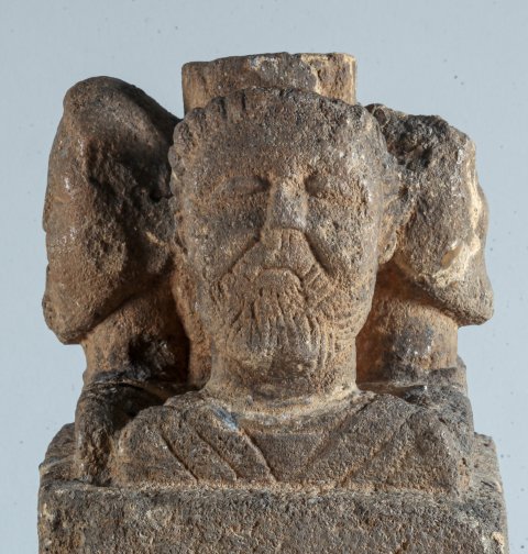 - Mythische Figuren (?): auf einem niedrigen kubischen Pfeiler vier bekleidete Schulterbüsten bärtiger Männer (Gottheiten ?) um einen zylindrischen Kern (Untersatz eines Beckens oder Tisches ?).
