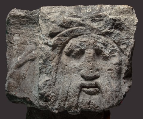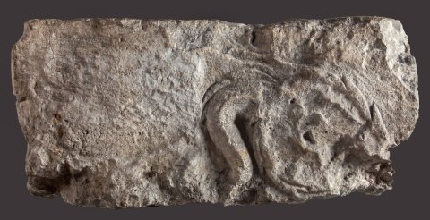 - Mythische Figur: Eckblock. Auf der Vorderseite am rechten Eck Maske eines Flussgottes, links davon Reliefrest (Meerwesen ?). Auf der rechten Nebenseite nach rechts hin schwimmender Delphin.