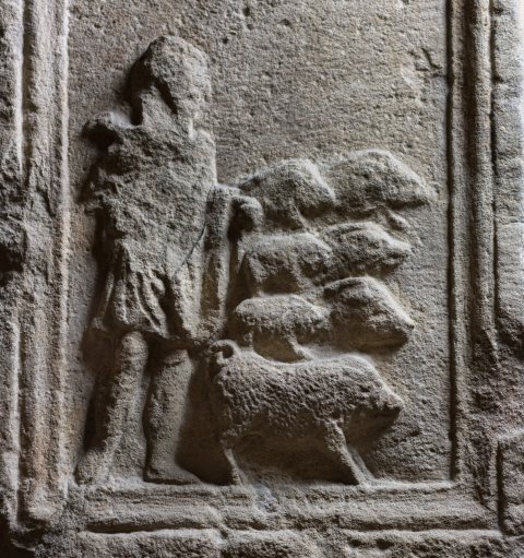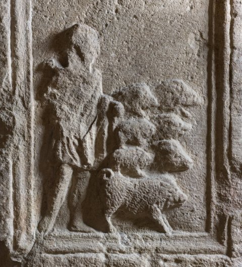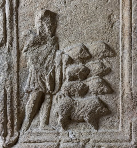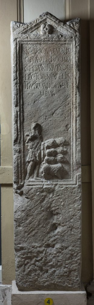 - Gerahmter Giebel mit Rosette und Eckakroteren, gerahmtes Feld mit Inschrift und darunter Relief eines Schweinehirten (suarius). Aus dem selben Grabbezirk wie Nr. 31773 ?