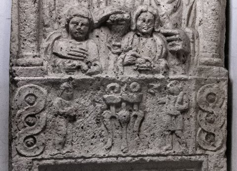- Im Hauptbild Familie: zwischen Säulen Brustbilder von drei Erwachsenen und zwei Kindern. Links Frau: Mittelscheitel, Tunica, Mantel. In der Mitte Frau: Halskette, in den Händen Korb mit Früchten. Rechts Mann: bärtig, Sagum, Scheibenfibel, Fingering, in der Linken Rolle (volumen). Vorn links Knabe, in den Händen Vogel, rechts Mädchen: offenes Haar, Tunica, Mantel, in der Linken Apfel. Zwischenbild mit Totenopfer: dreibeiniger Tisch mit Speisen, links Dienerin, rechts Diener. Seitlich Flechtband.