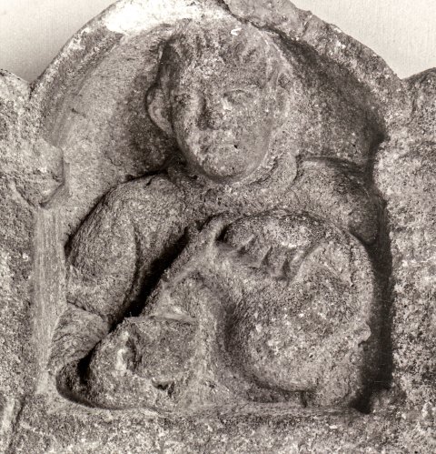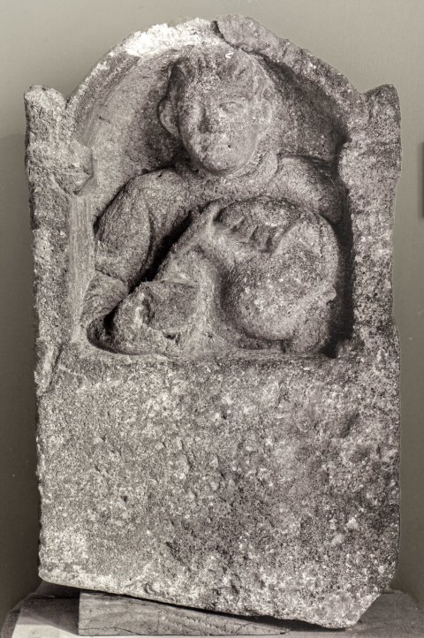 - Bogennische auf Pfeilern, Seitenakrotere, in der Nische Halbfigur eines bartlosen Mannes im Ärmelgewand, der aus einer bauchigen Kanne in einen Becher einschenkt. Weinhändler ?