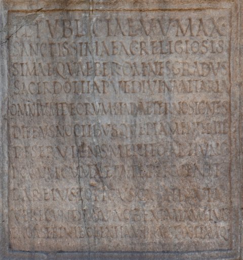 - Fl(aviae) Publiciae v(irgini) V(estali) max(imae) / sanctissimae ac religiosis/simae quae per omnes gradus / sacerdotii aput(!) divina altaria / omnium deorum et ad aeternos ignes / diebus noctibusque pia mente rite / deserviens merito ad hunc / locum cum aetate pervenit / Bareius Zoticus cum Flavia / Verecunda sua ob eximiam eius / erga se bene<v=B>olentiam praestantiamq(ue) // dedicata pr(idie) Kal(endas) Oct(obres) / dd(ominis) nn(ostris) Valeriano Aug(usto) IIII et / Gallieno Aug(usto) III co(n)ss(ulibus)