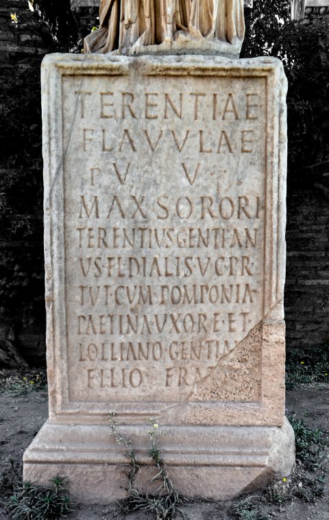 - Terentiae / Flavulae / v(irgini) V(estali) / max(imae) sorori / Terentius Gentian/us fl(amen) Dialis v(ir) c(larissimus) pr(aetor) / tut(elaris) cum Pomponia / Paetina uxore et / Lolliano Gentian[o] / filio frat[ris]