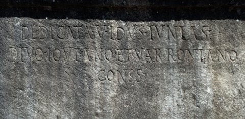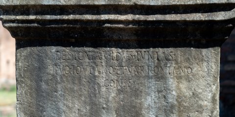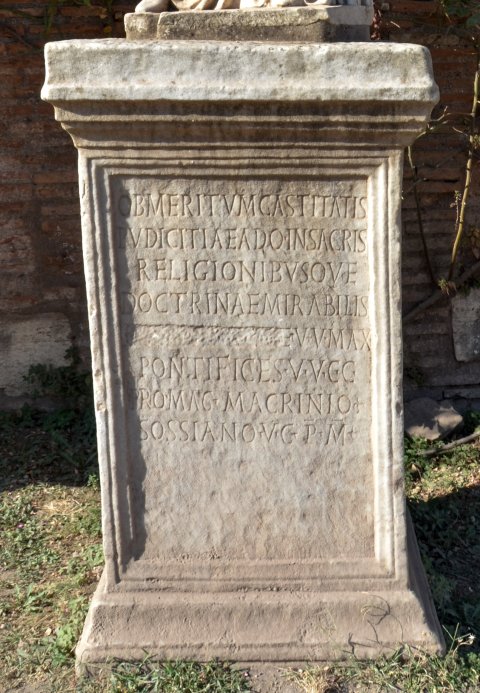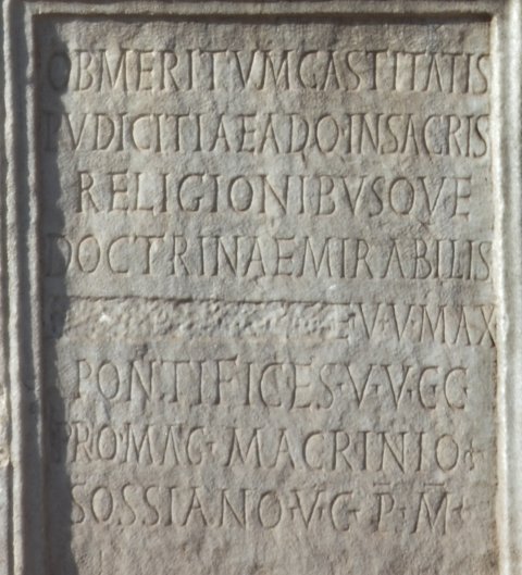 - Ob meritum castitatis / pudicitiae adq(ue) in sacris / religionibusque / doctrinae mirabilis / C[[---]]e v(irgini) V(estali) max(imae) / pontifices vv(iri) cc(larissimi) / promag(istro) Macrinio / Sossiano v(iro) c(larissimo) p(ontifice) m(aiore?) // Dedicata V Idus Iunias / divo Ioviano et Varroniano / conss(ulibus)