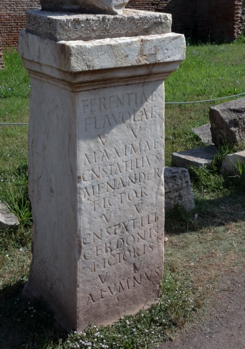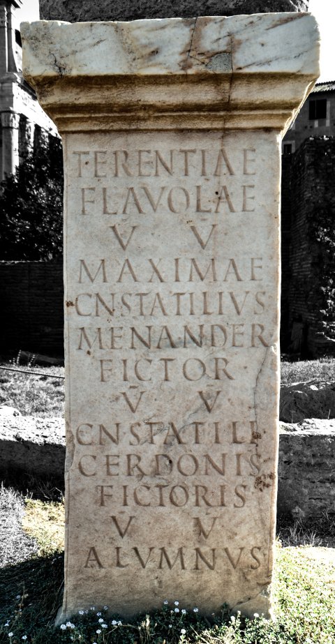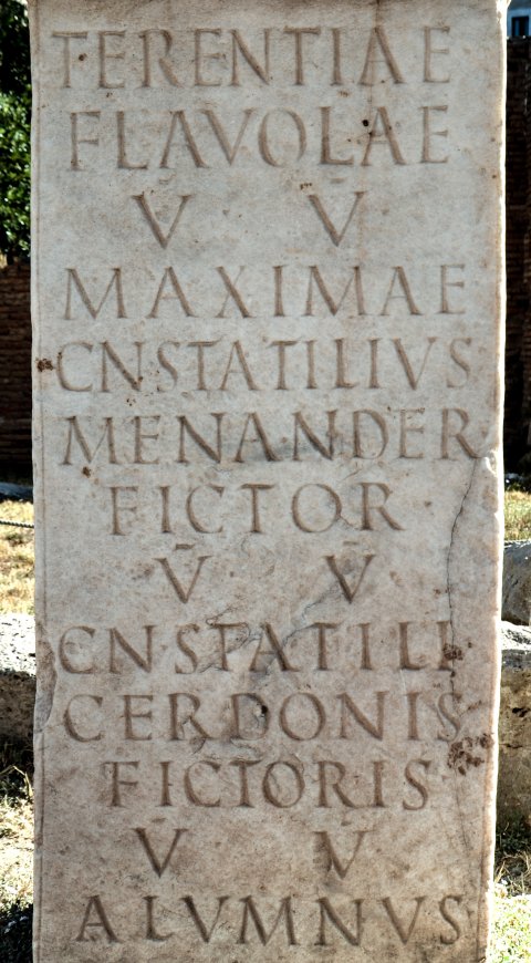 - Terentiae / Flavolae / v(irgini) V(estali) / Maximae / Cn(aeus) Statilius / Menander / fictor / v(irginum) V(estalium) / Cn(aei) Statili / Cerdonis / fictoris / v(irginum) V(estalium) / alumnus