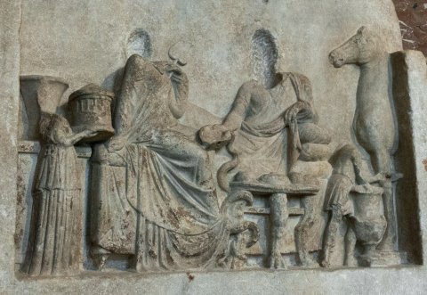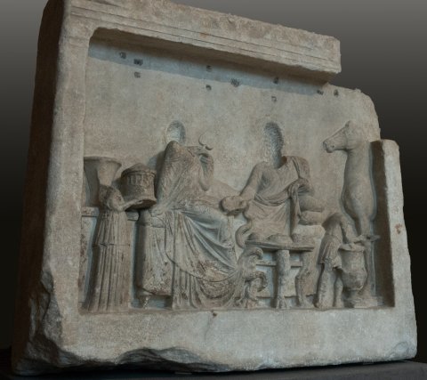 - Totenmahl: Seitlich glatte Pilaster, darüber Architrav. Auf Kline gelagerter Mann in Chiton und Mantel, in der rechten Hand Schale, aus der eine Schlange trinkt, die sich um das Bein eines Tischchens mit Löwenbeinen windet. Auf dem Fußende der Kline sitzende Frau im Mantel, in der linken Hand Fächer. Von links kommende kleine Dienerin mit rundem Deckelkorb (Ciste) in den Händen, rechts Diener mit Schale, der sich über einen großen Krater beugt. Hinter dem rechten Pilaster auftauchendes Vorderteil eines Pferdes. Unterhalb des Architravs Reihe von Bohrungen (für Metallverzierungen ?).