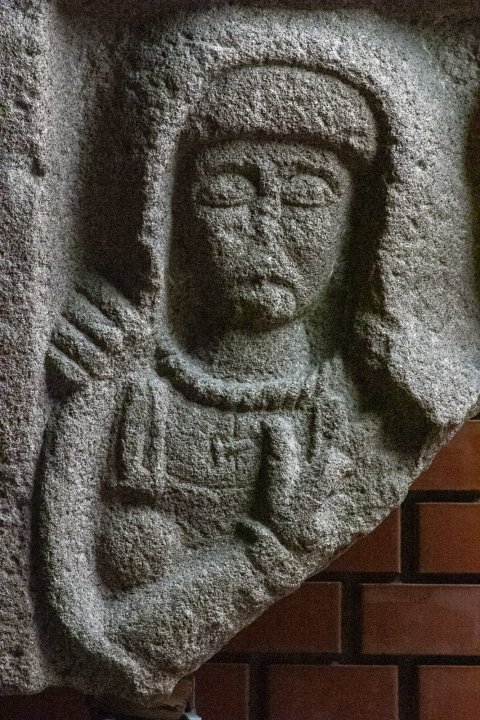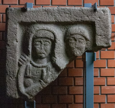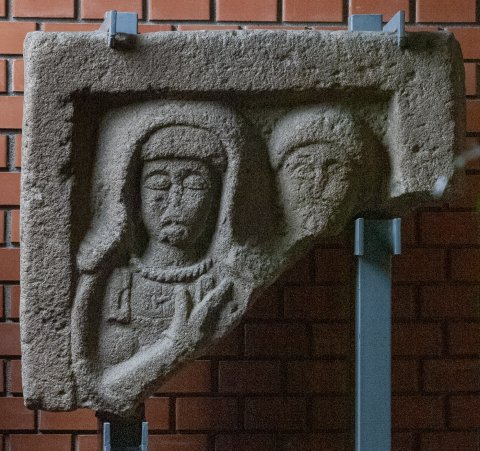 - In Rechtecknische zwei Brustbilder (Ehepaar). Links einheimische Frau: Haube, Schleier, Fibeln, Brosche, Torques, Armreifen, Ohrgehänge. Rechts Mann mit Schnurrbart.