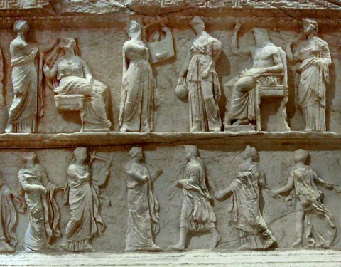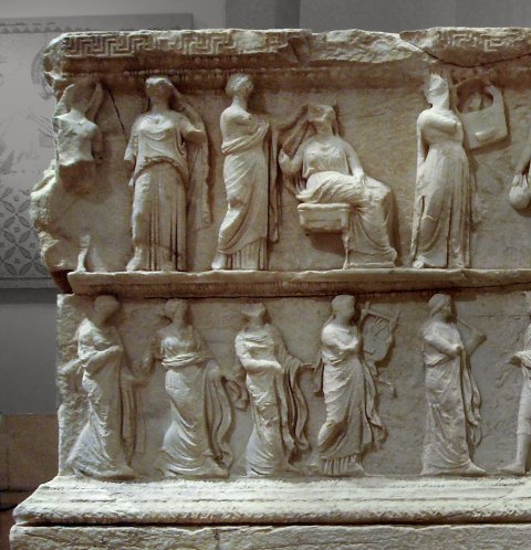 Oberes Register: Auf der Vorderseite Götterversammlung, im Zentrum Apollo Kitharoidos und Athena mit Helm in der Hand. Hinter Apollo sitzende Leto, Artemis und weibliche Gottheit, ganz links Ares ? (Semele und Dionysos ?). Hinter Athena thronender Zeus, Hera, Göttin (Amphitrite ?) und Poseidon (oder Aphrodite und Ares ?),
