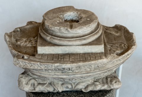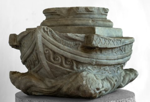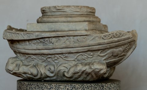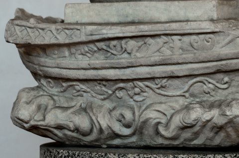 - Über stilisierten Wellen mit Fischen Schiff mit reliefierten Wänden (unten Fries mit Spiralhaken, Blütenranke und laufendem Löwen, oben Waffenfries mit Peltenschilden). Auf dem Deck Säulenbasis.