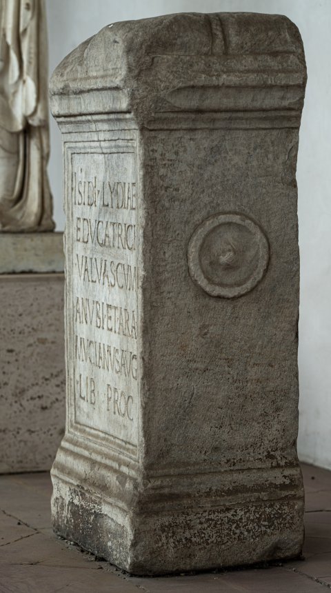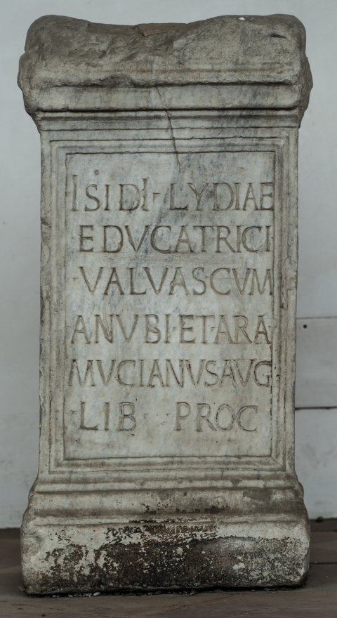 - Isidi Lydiae / educatrici / valvas cum / Anubi et ara(m) / Mucianus Aug(usti) / lib(ertus) proc(uravit?)