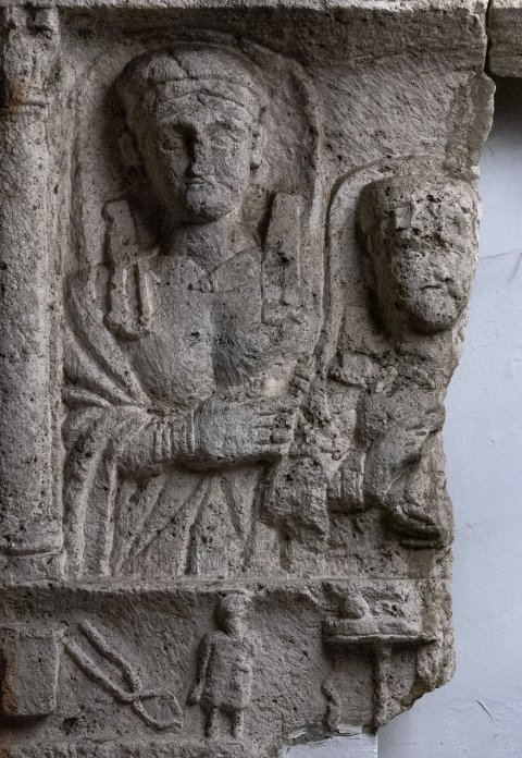 Im Hauptbild Familie: zwischen Säulen Brustbilder eines Ehepaares mit Tochter. Links einheimische Frau: Haube, Schleier, Unter- und Obergewand, Flügelfibeln, Brosche, Umhang, Armbänder. In der Mitte einheimisches Mädchen: Haube, Schleier, Fibeln, Armbänder. Rechts Mann(weggebrochen).