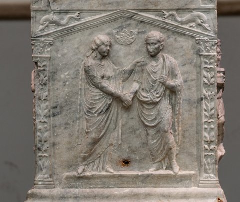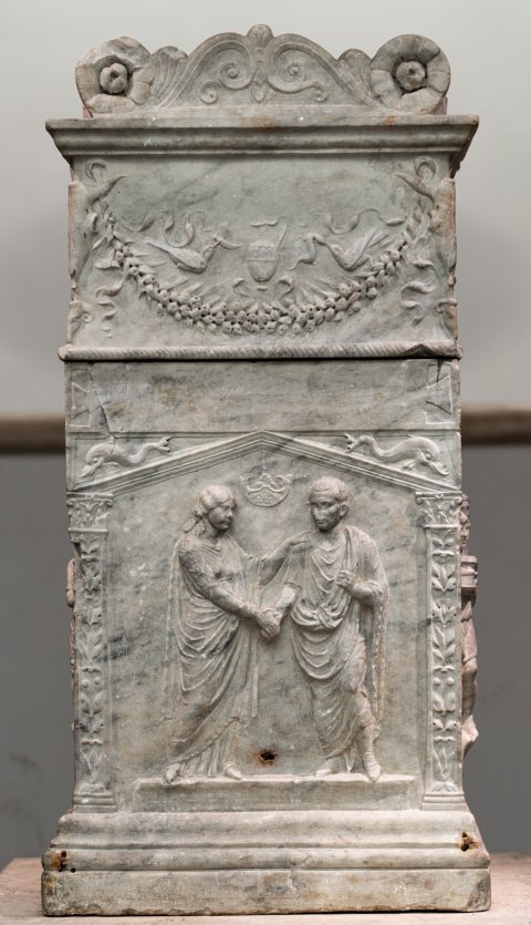 Altarschaft mit figürlichen Reliefs auf vier Seiten. Vorderseite: offener Giebel auf Reliefpilastern, auf den Giebelschrägen Delphine. Auf flachem Podest stehendes Ehepaar, Frau in Ärmeltunica und Mantel, Mann bartlos, in Toga; zwischen den Köpfen hängender Peltenschild.