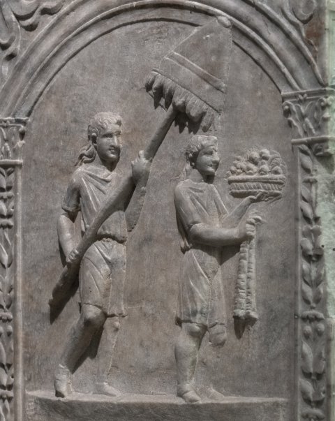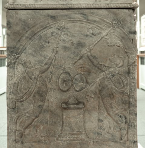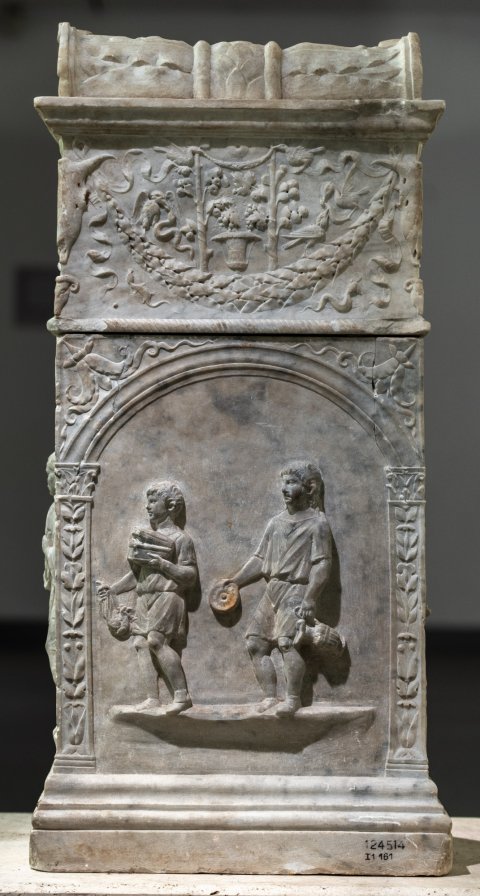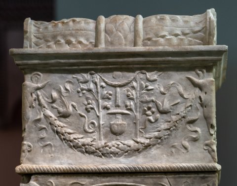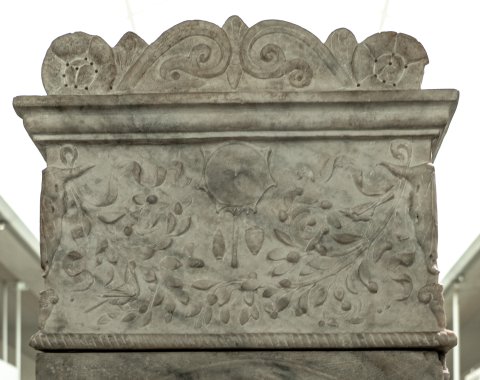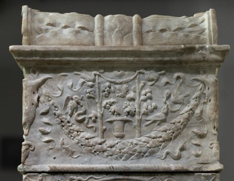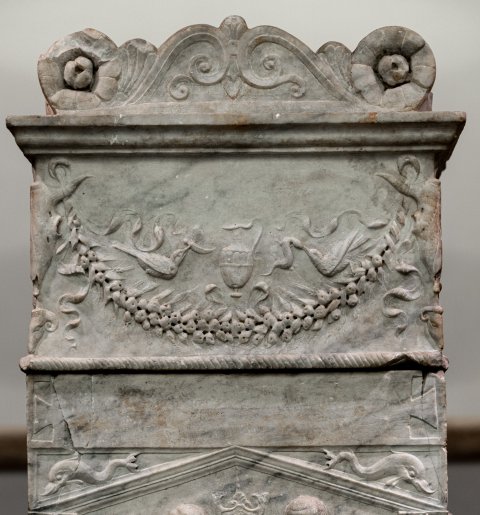 Hoher Aufsatz (Aschenkiste), oben geschnürte pulvini mit Rosetten, dazwischen auf Vorder-und Rückseite gegenständige Spiralranken. Auf drei Wänden der Aschenkiste an Bukranien hängende Girlanden, vorn mit Kanne zwischen Vögeln, auf den Nebenseiten im Girlandenbogen Gefäße, Tiere (Schlangen, Vögel), Blütenzweige, Trauben. Auf der Rückseite (eigentlich Vorderseite ?) Olivenzweige mit Vögeln, daüber Spiegel zwischen Salbgefäßen.