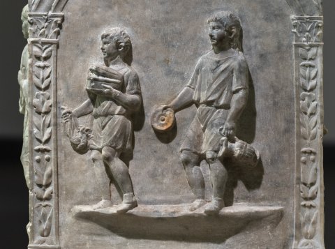 Auf der Rückseite unter dem Bogen zwei zu Seiten eines Altars tanzende Mänaden mit Thyrsosstäben.