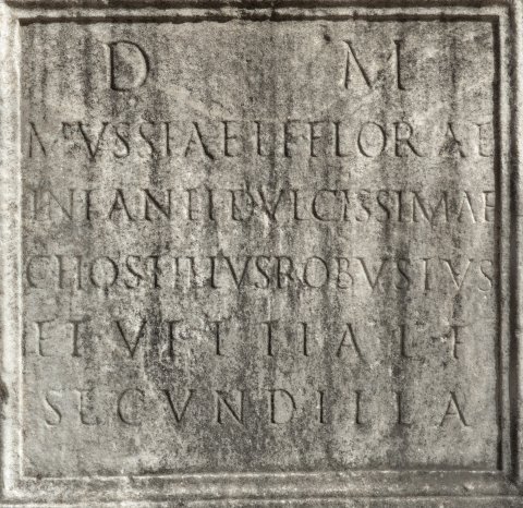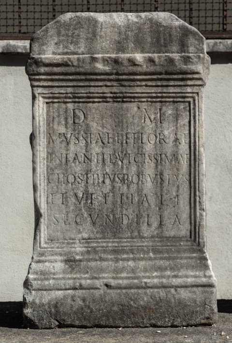 - D(is) M(anibus) / Mussiae L(uci) f(iliae) Florae / infanti dulcissimae / C(aius) Hostilius Robustus / et Vettia L(uci) f(ilia) / Secundilla