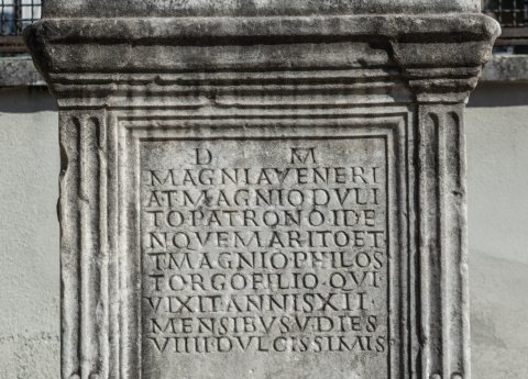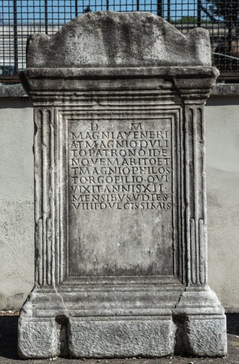 - D(is) M(anibus) / Magnia Veneri/a T(ito) Magnio Duli/to patrono ide/nque(!) marito et / T(ito) Magnio Philos/torgo filio qui / vixit annis XII / mensibus V die(bu)s / VIIII dulcissimis