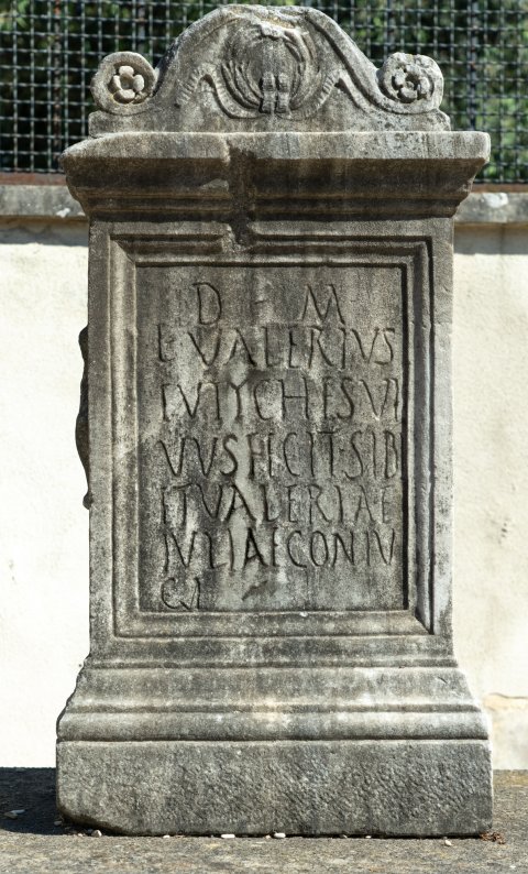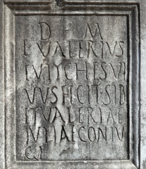 - D(is) M(anibus) / L(ucius) Valerius / Iutyches(!) vi/vus fecit sibi / et Valeriae / Iuliae coniu/gi