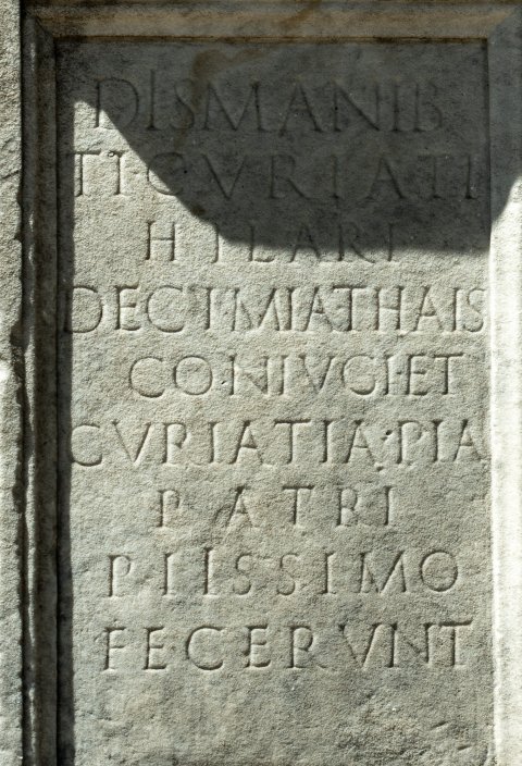 - Dis Manib(us) / Ti(beri) Curiati / Hilari / Decimia Thais / coniugi et / Curiatia Pia / patri / piissimo / fecerunt