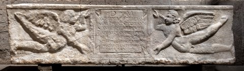- tabula ansata, getragen von zwei fliegenden Eroten
