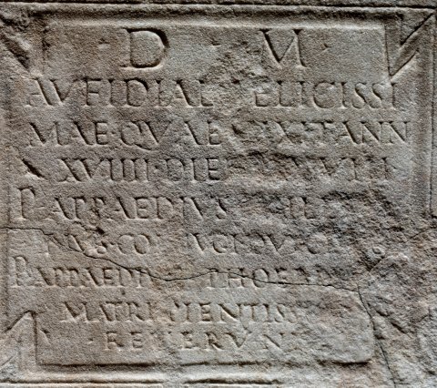 - D(is) M(anibus) / Aufidiae Felicissi/mae quae vixit ann(is) / XVIIII dieb(us) XXVIII / P(ublius) Appaedius [P]hiletia/nus coniugi dulcis[simae] / P(ublius) Appaedius Phoebia[n]us / matri pientissim[ae] / fecerunt