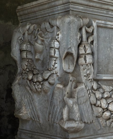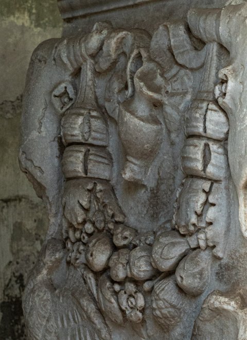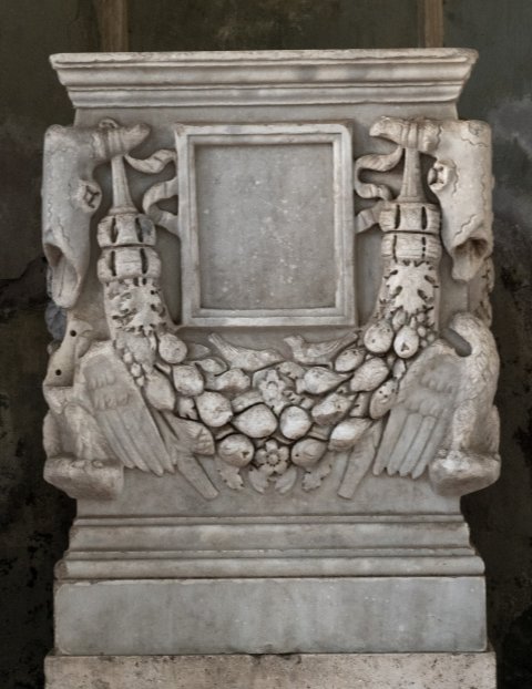 - An drei Seiten Fruchtgirlanden, die an Bukranien hängen; unter den Bukranien stehende Adler. Auf der Vorderseite gerahmtes leeres Schriftfeld.