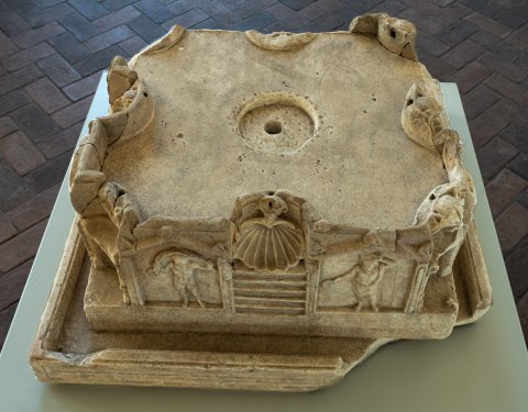 - Teile abgebr., in der Mitte der Oberseite runde Vertiefung, darin Bohrung für Wasserrohr; Bohrungen für Wasserauslauf in der Mitte und an den Ecken der vier Wände