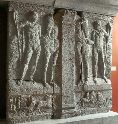 Im Hauptbild mythische Figuren (Dioskuren): In zwei Feldern zwischen glatten Pilastern jeweils Reste eines Pferdevorderteils und menschliche Füße.