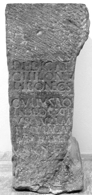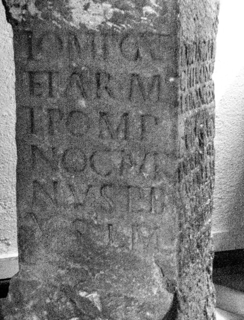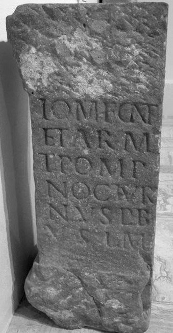 - I(ovi) O(ptimo) M(aximo) font(em) / et ar[a]m / T(itus) Pomp(eius) Noctur/nus PLB / v(otum) s(olvit) l(ibens) m(erito) // Dedicat(a) / Chilone [e]t / Libone co(n)s(ulibus) / cui{i}us aq(uam) / inde duxit / usq(ue) vill(a)m(?) / Flaviac(a)m / tubo pl(u)mb(eo) / TAR n(umero?) DX