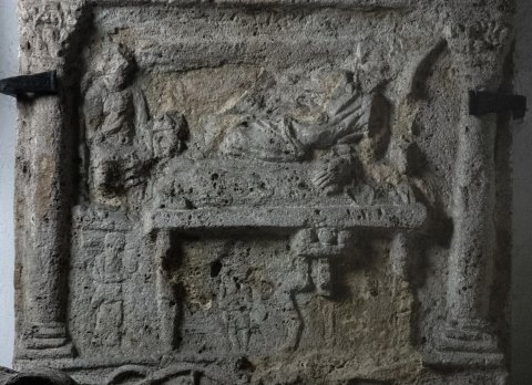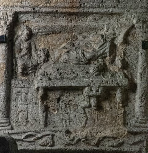 - Giebel mit Rosette und Seitenakroteren. Im Hauptbild Totenmahl: zwischen Säulen Mann im Mantel auf Kline, am Fußende auf Sessel sitzende Frau. Unter der Kline Diener und dreibeiniger Tisch mit Gefäßen, unter der Frau Dienerin. Auf der Rahmenleiste des Schriftfeldes Ranke.