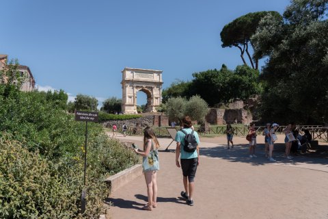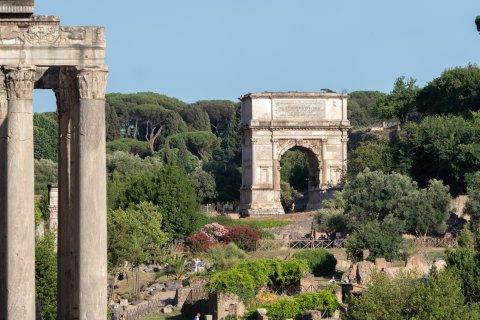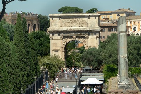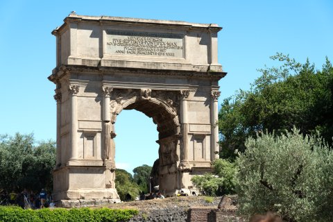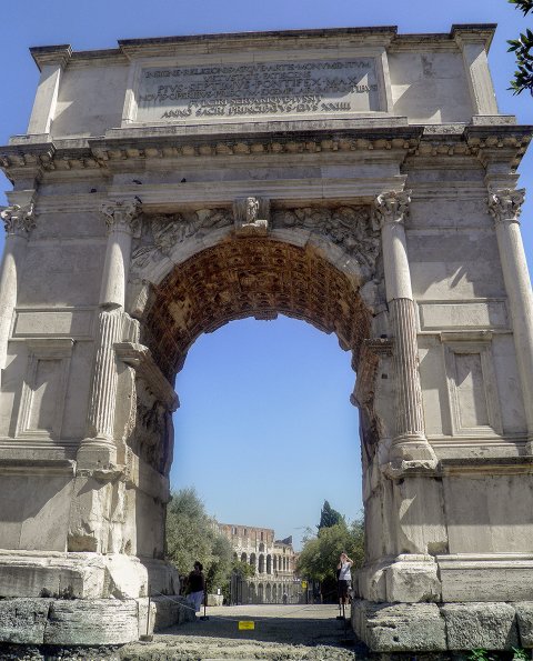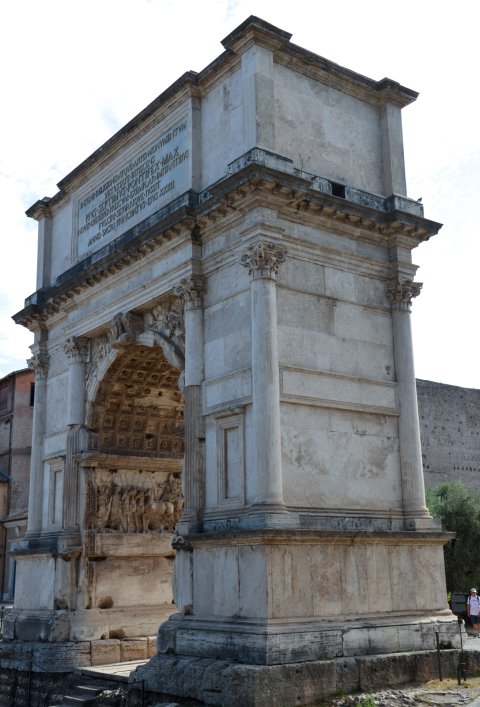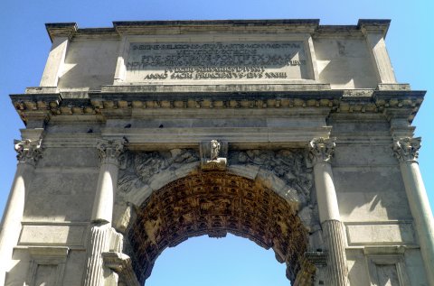 Über den Bogendurchgängen Victorien. Im Durchgang: Kassettendecke mit Relieffeld (Apotheose des Titus) im Zentrum, auf den Seitenwänden Darstellungen des Triumphzuges nach dem Sieg des Titus in Judäa 70 n.Chr. - Inschrift