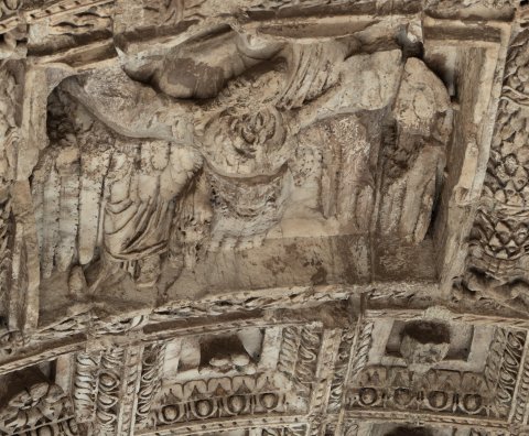 Im Zentrum quadratisches Relieffeld mit Darstellung der Divinisierung des Titus, der, bekleidet mit der Toga, auf einem Adler mit ausgebreiteten Schwingen reitet. Den Rahmen des Reliefs bilden Lorbeergirlanden, die an den Ecken von kleinen Genien gehalten werden.