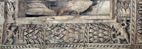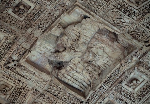 Tonnendecke mit Kassetten und Mittelrelief. Kassetten mit Rosettenfüllung, gerahmt von Kyma, Eierstab und tordierten Bändern.