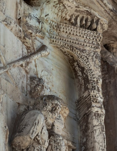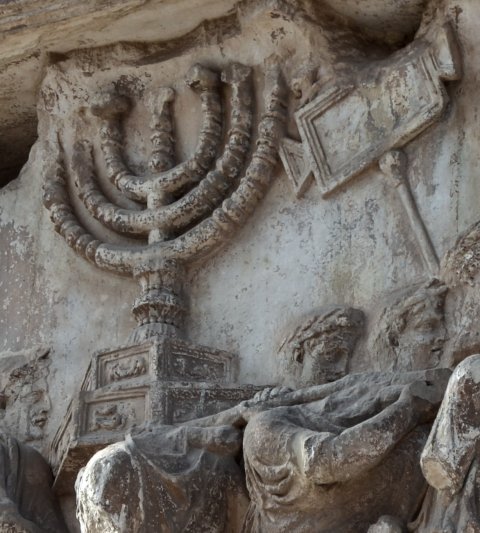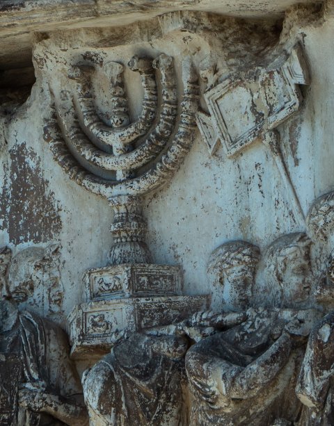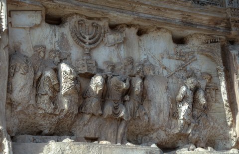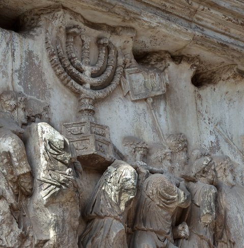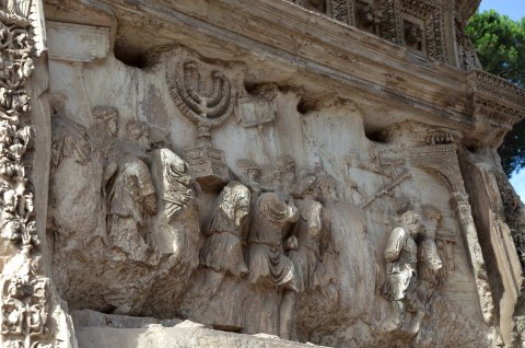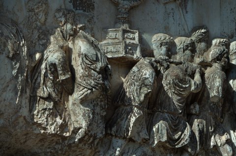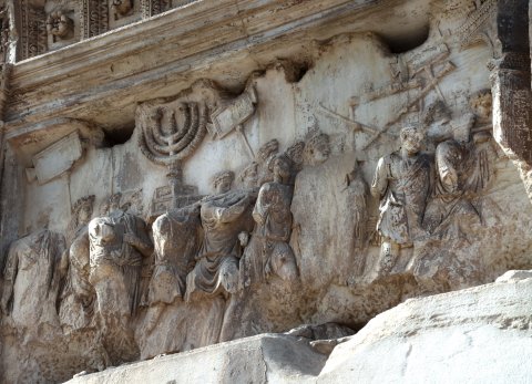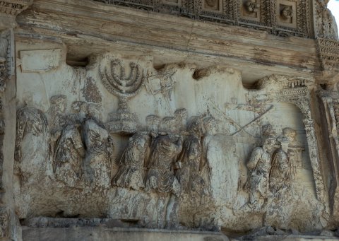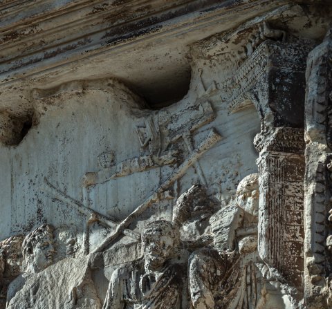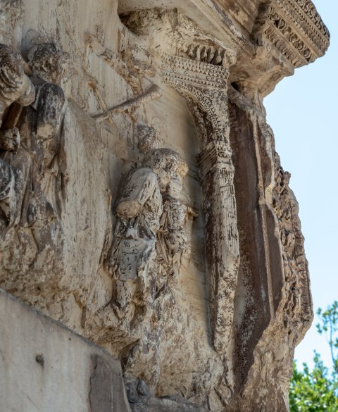 - Relief im Durchgang des Bogens. Soldaten, die auf Schaugerüsten Beutestücke aus dem Tempel von Jerusalem durch die Porta Triumphalis tragen.Im Hintergrund Ortspersonifikationen, deren Namen auf Tafen an langen Stangen aufgemalt waren.