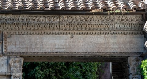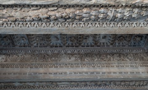 Auf der Unterseite des Gebälks kymationgerahmte Soffitte mit Blattornament. Kassettendecke mit Rosetten. - Inschrift