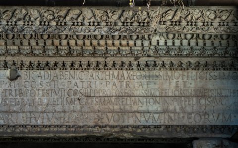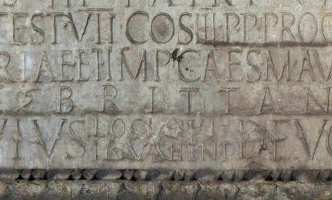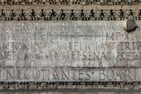 - Imp(eratori) Caes(ari) L(ucio) Septimio Severo Pio Pertinaci Aug(usto) Arabic(o) Adiabenic(o) Parth(ico) max(imo) fortissimo felicissimo / pontif(ici) max(imo) trib(unicia) potest(ate) XII imp(eratori) XI co(n)s(uli) III patri patriae et / Imp(eratori) Caes(ari) M(arco) Aurelio Antonino Pio Felici Aug(usto) trib(unicia) potest(ate) VII co(n)s(uli) I«II p(atri) p(atriae) proco(n)s(uli) fortissimo felicissimoque principi» et / Iuliae Aug(ustae) matri Aug(usti) «n(ostri)» et castrorum et «senatus et patriae et» Imp(eratoris) Caes(aris) M(arci) Aureli Antonini Pii Felicis Aug(usti) / «Parthici maximi Brit{t}annici maximi» / argentari(i) et negotiantes boari(i) huius loci qui invehent devoti Numini eorum