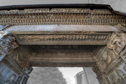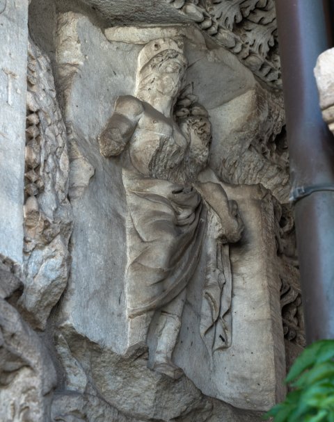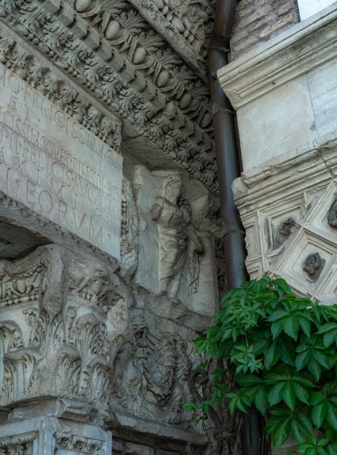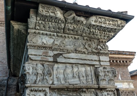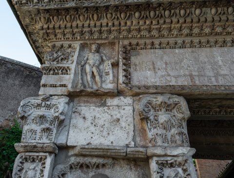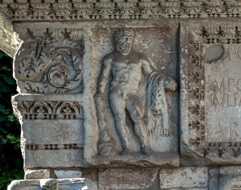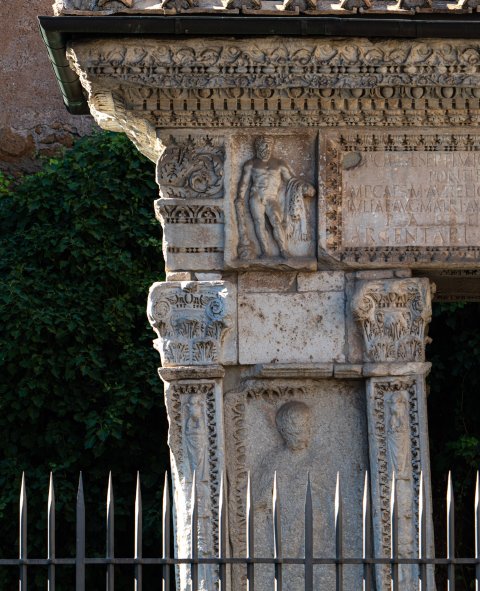Gesims mit Palmettenfries, Perlstab, Rankenfries, Eierstab, Zahnschnitt, Blattkymation. Über dem Durchgang auf dem Architrav Schriftfeld gerahmt mit Blattkymatia. Seitlich davon Reelieffelder mit Hercules und Genius. Auf den Außenseiten unter dem Gesims Akanthusranke und Architrav mit Perlstab.