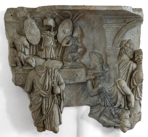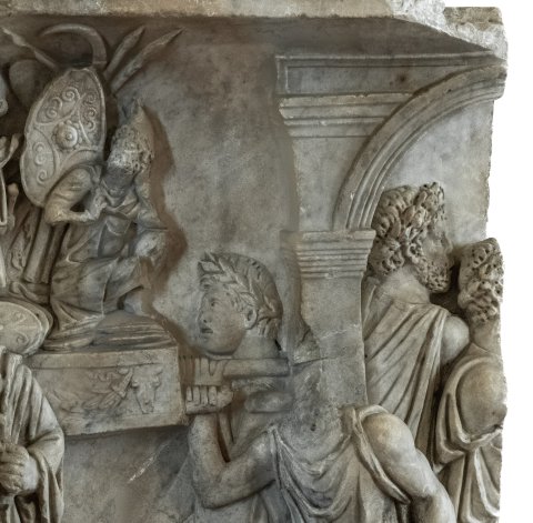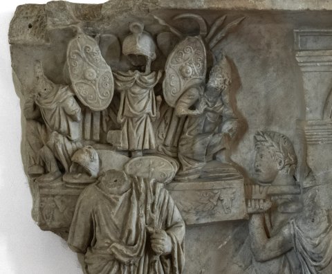Triumphzug mit Bahre, darauf Tropaion mit Waffen und seitlich davon kauernden Gefangenen mit phrygischen Mützen (Parther). Von den vier Trägern sind nur die zwei jugendlichen rechts tlw. erhalten. Vor der Bahre frontal stehender Mann in kurzer Tunica und togaähnlichem kurzen Mantel (camillus ?).