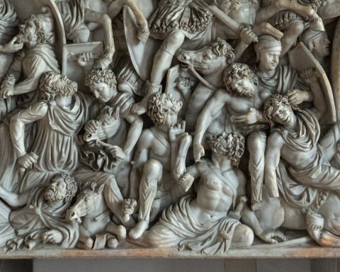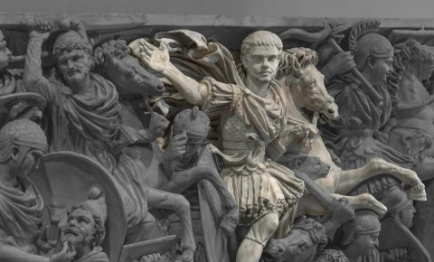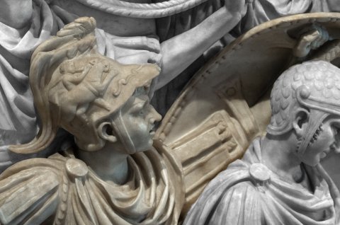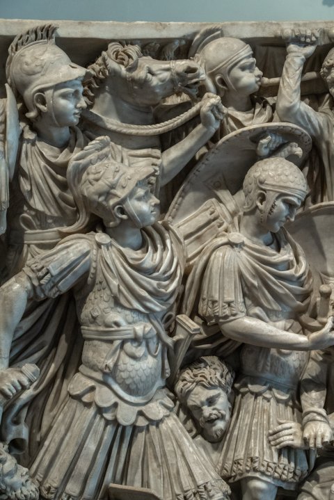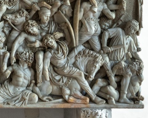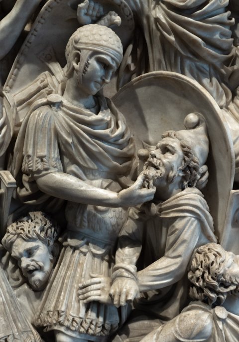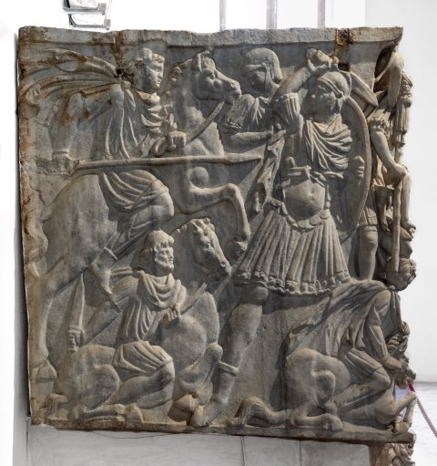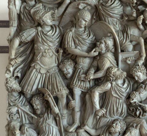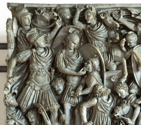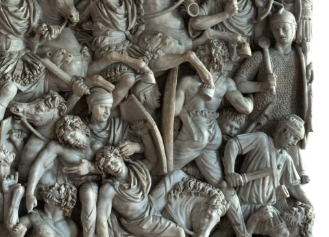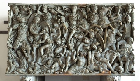 Schlacht Römer gegen Barbaren (Ostgoten ?), im Zentrum oben der siegreiche jugendliche Feldherr mit x-förmiger Narbe auf der Stirn (Eingeweihter des Mithraskultes), einer der Söhne des Kaisers Decius ?