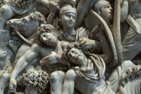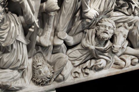 Auf den Nebenseiten Kampfszenen in flachem Relief.