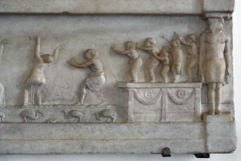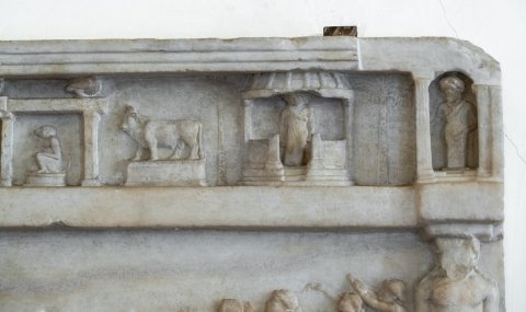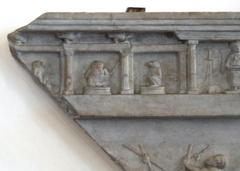 In der Reliefzone darunter Tänzerinnen mit erhobenen Armen und Musikanten, auf dem Sockel unter den Figuren Ibisse und ein Krebs. Rechts altarförmige Basis mit Girlanden und Rosetten zwischen Pilastern, darauf eine Gruppe von Flötenspielern. Ganz rechts kolossale Statue, die das Gebälk trägt, frontal stehend, ägyptischer Schurz, Gesicht abgeschlagen, in den Händen Attribute.