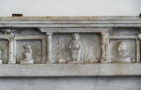 Reliefplatte horizontal in Zonen geteilt. Oben offene Säulenhalle, in der Mitte breiteres Interkolumnium mit thronender Frau (Göttin ?) zwischen zwei Kandelabern. In den Interkolumnien seitlich davon auf Podesten kauernde Affen und Besfiguren, auf dem Architrav darüber Vögel.