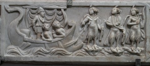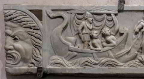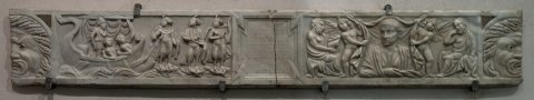 In der Mitte tabula ansata mit Inschrift, an den Ecken tragische Masken. Im linken Bildfeld Mythos (Odyssee): Schiff mit Odysseus und zwei Gefährten, rechts davon drei stehende Sirenen mit Musikinstrumenten (Flöten, Lyra).