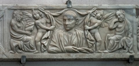 Im rechten Bildfeld Brustbild eines Mannes, hinter dem zwei Eroten (Genius) eine Draperie aufspannen. Seitlich je ein sitzender bärtiger Philosoph, der linke mit geöffneter Rolle (volumen). - Inschrift