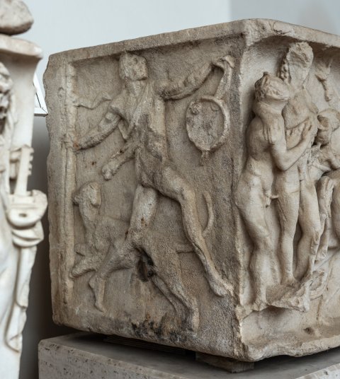 Auf den Nebenseiten rechts drei Satyrn, links tanzender Satyr und Panther.