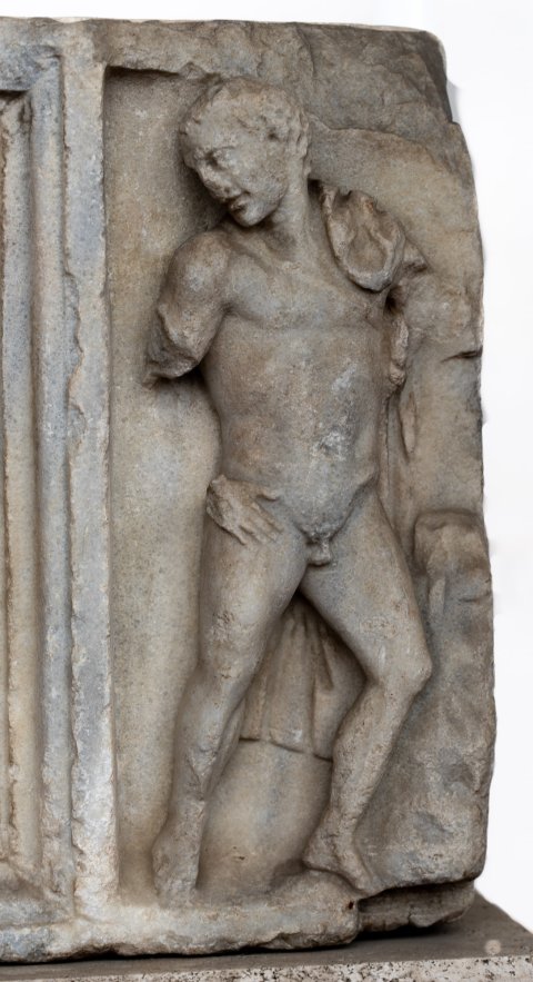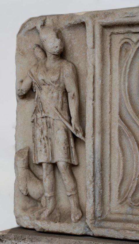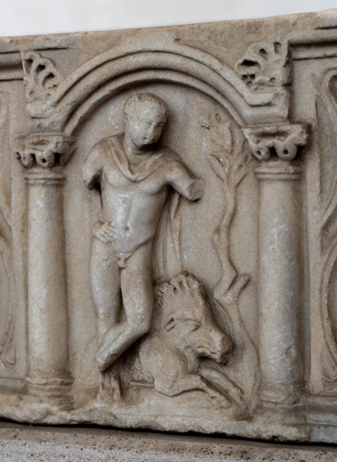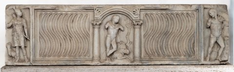 Mythische Figuren. Vorderseite mit Riefeln und Bildfeld in der Mitte und an beiden Seiten. In der Mitte unter profiliertem Bogen auf Säulen stehender Meleager, zu seinen Füßen liegender Eber, im Hintergrund Baum.
