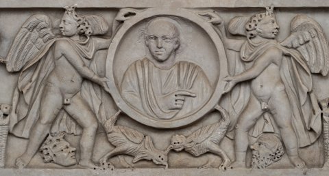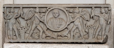 - Rundes Medaillon mit Brustbild eines Mannes, getragen von Eroten; seitlich stehende Eroten mit Jahreszeiten-Attributen (links Winter mit Schilfstängel und erlegten Wasservögeln, rechts Herbst mit Pedum und erlegtem Hasen). Zwischen den Eroten links Korb mit Blumen, rechts mit Früchten. Zwischen den Füßen der tragenden Eroten Masken. Unter dem Medaillon zwei kämpfende Hähne.