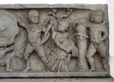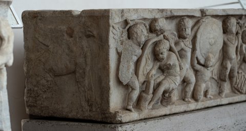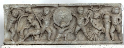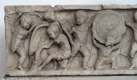 Kindersarkophag. Auf der Vorderseite Eroten als Waffenschmiede. Links drei Eroten um einen Amboss, in der Mitte Rundschild, von knienendem Eroten getragen und von zwei Eroten seitlich gehalten. Rechts Erot, der einen Brustpanzer hält und Erot mit Helm auf Säule.