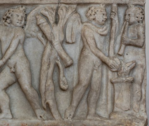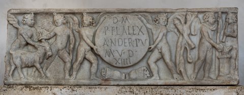 - Kindersarkophag mit rundem rahmenlosen Schriftfeld, getragen von zwei Eroten; unter der Tafel zwei umgestürzte Körbe. Links zwei Eroten mit Ziegenbock, rechts zwei Eroten an einem Altar, der rechte bläst Flöte, der andere opfert; hinter ihm Baum mit daran hängenden Waffen (Köcher, Bogen, Schleuder ?).