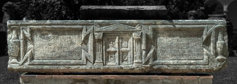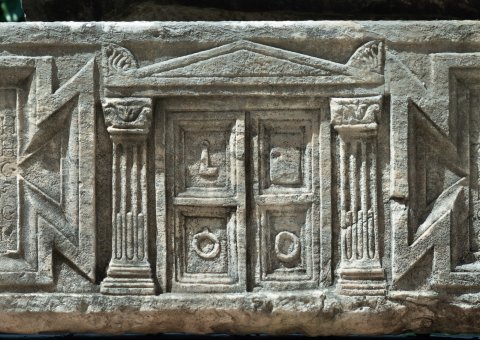 - Zwei tabulae ansatae mit Inschrift, dazwischen Türrelief, gerahmt von Giebel und Pilastern. Seitlich Vasen.