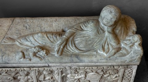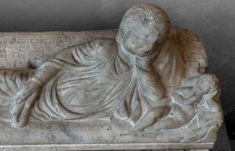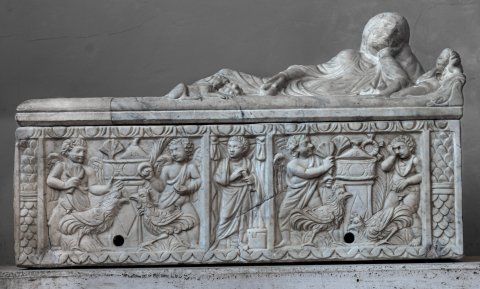 Kindersarkophag. Auf dem flachen Deckel liegende Frau, neben dem aufgestützten linken Arm liegendes nacktes Kleinkind (Knabe), bei den Beinen liegender Hase mit Weintraube.